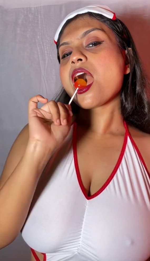 The hot nurse tease on a lollipop like it’s a dick, teasing the camera with her slutty eyes. She slowly pulls off her red cross bikini, letting her massive boobs spill out. Her nipples are already hard as she squeezes her tits together, moaning softly. She bends over, shaking her ass while rubbing her wet pussy through the tiny bikini bottoms.